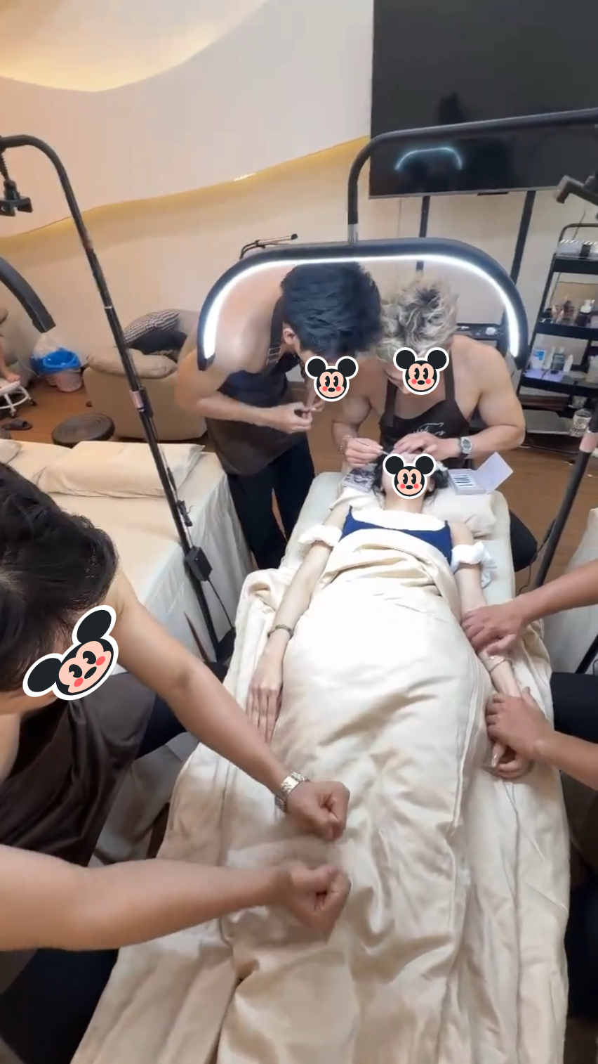 丈夫到了现场,看到妻子被几个男服务员围着,一个给她种睫毛,一个给她按手,一个给她按脚,一个喂她吃喝,看上去很享受的样子。