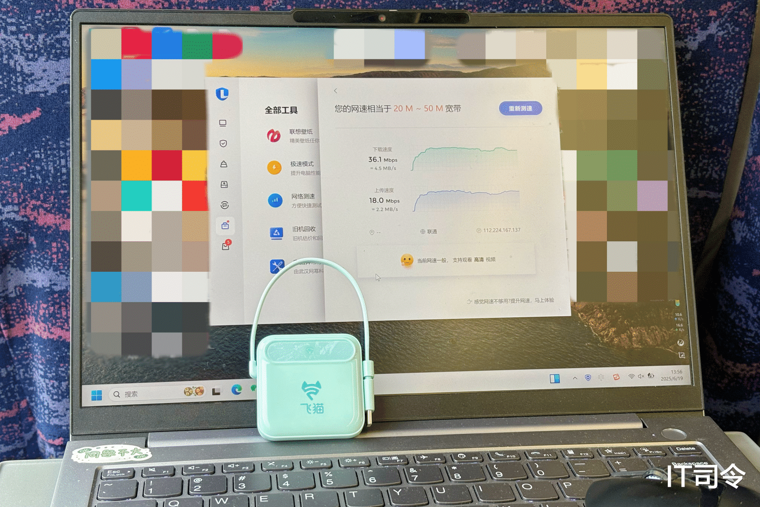 我在高速运行的火车上,电脑测试的下载速度是36Mbps,上传速度是18Mbps。