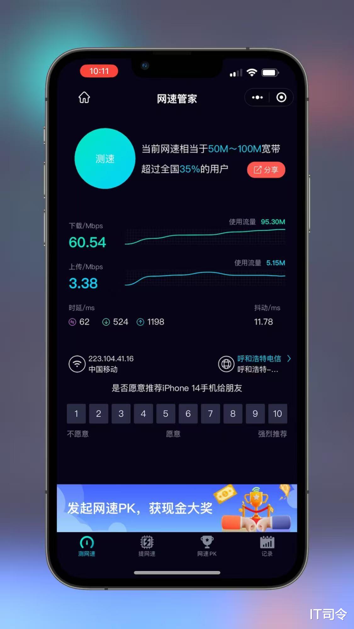 手机测试的下载速度是60.5Mbps,上传速度是3.4Mbps,测试地点不同,速度稍有差距。