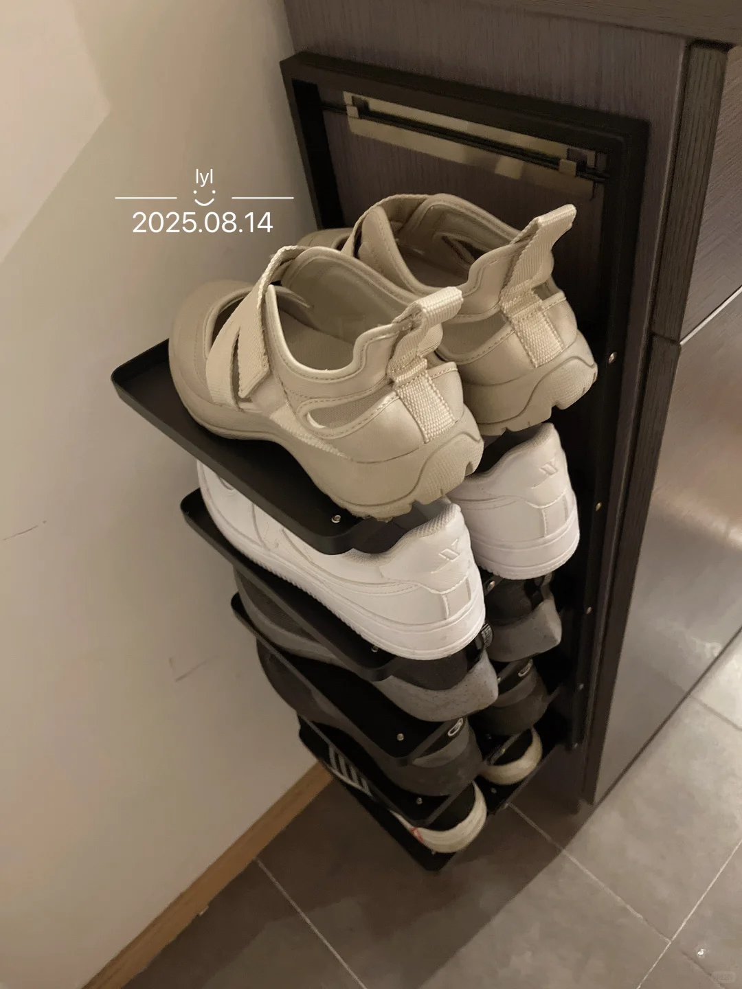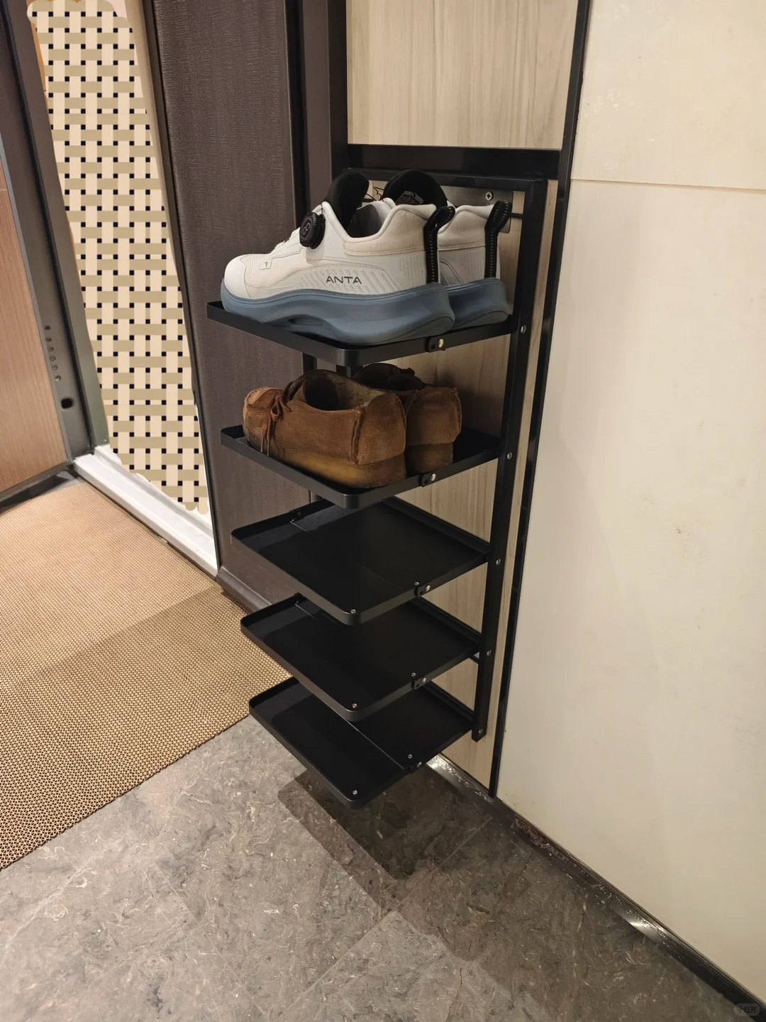 把它固定在墙面上,就能收纳5双鞋,而且还不占什么地方,一般一两个人是足够用了。