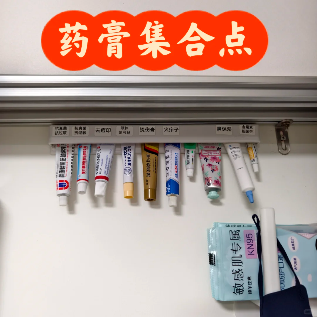 毕竟都是膏状的东西,来收纳药膏再合适不过了,立马给柜子上贴一个,然后将所有的药膏全都夹上去。