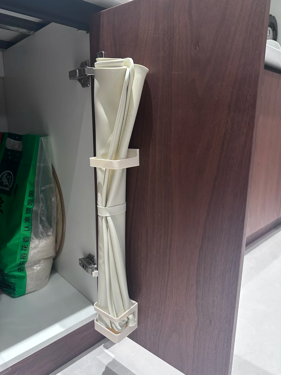 我们可以把上下两个盒子粘贴在柜门的内侧,然后再把揉面垫卷起来,然后放进去收纳,这样一来,揉面垫就可以立在门板上了。