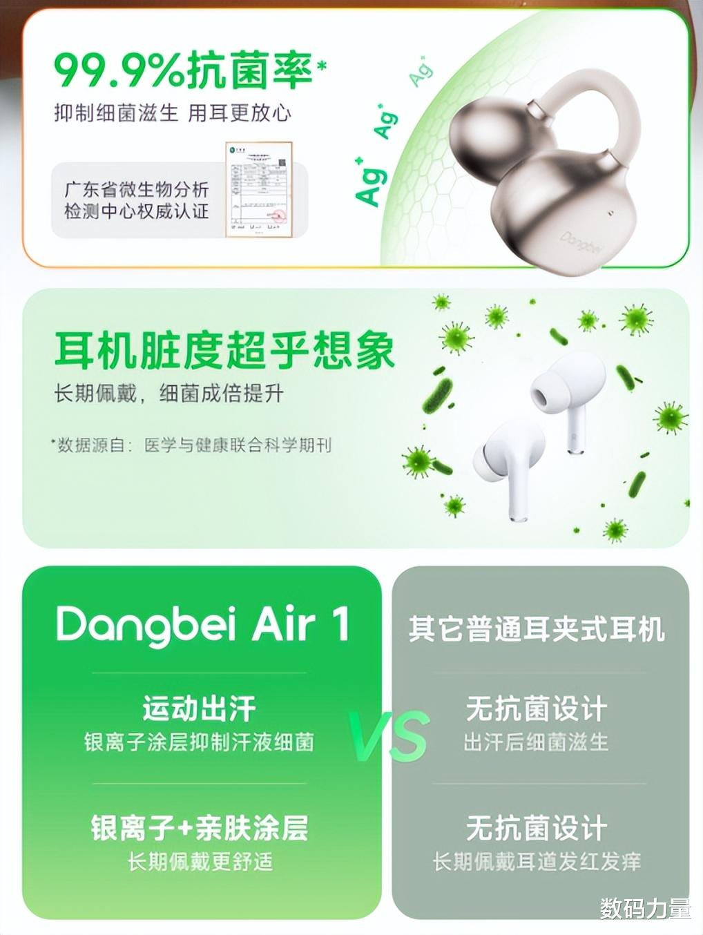 运动耳机绕不开汗液与皮脂,开放式虽减少耳道闷热,但耳廓接触部位依然需要耐脏与易清洁。当贝Air1主打的银离子抗菌思路,能降低细菌滋生风险,长时间佩戴更舒畅。