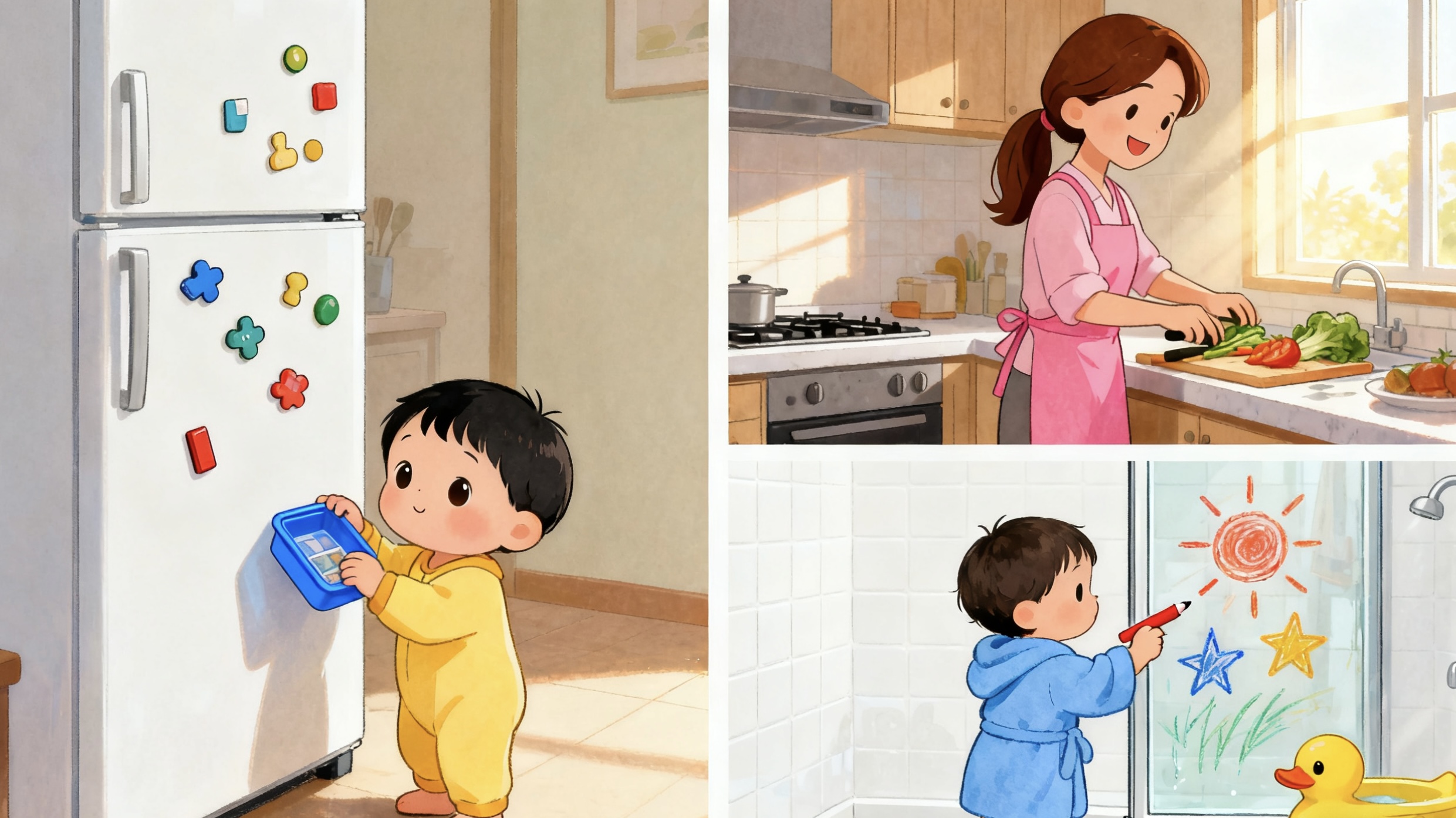 把彩色纽扣、绒球装进保鲜盒,贴磁铁,吸在冰箱低位。你做饭,他“做饭”,双赢。