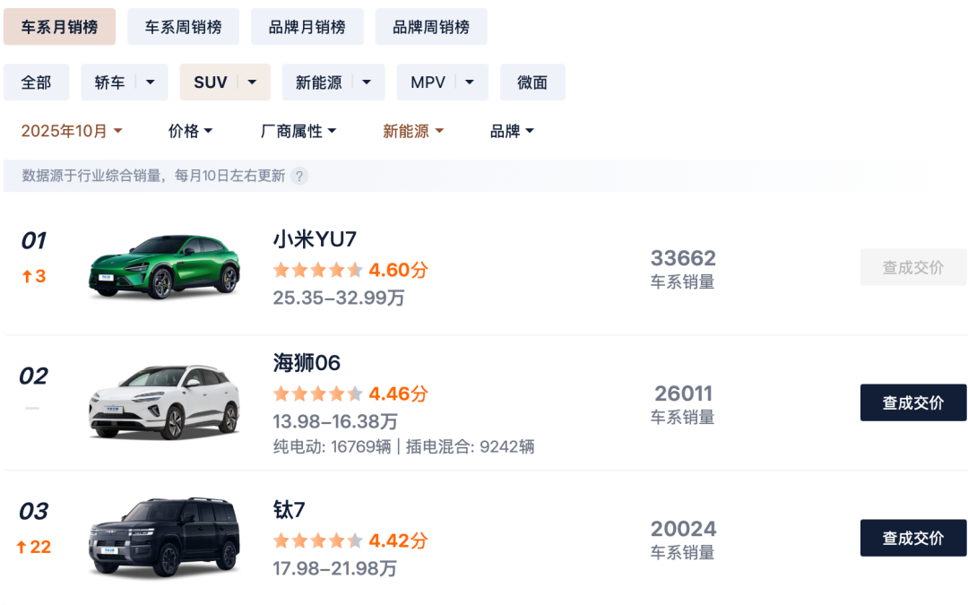 2025年10月份销量榜出炉,懂王为您详细解读2025年10月新能源SUV前3名车型,小米排名第一,特斯拉Model Y第一次被国产车超越,由此可见国产新能源汽车格局正在发生改变,今天我们就来详细分析排名前五的车行,附排名前20名车型供大家参考。