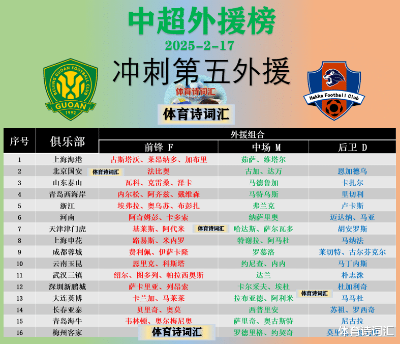 北京国安:【法比奥、古加、达万、恩加德乌、第五外援待定】;