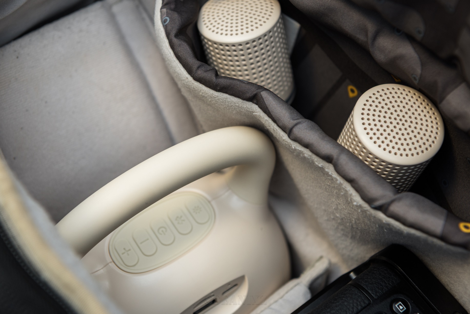 产品体积适中,不会占用太多空间,可以轻松放入背包或手提袋中,我的国家地理相机包也可以轻松塞进去,与一台微单机身体积相当。