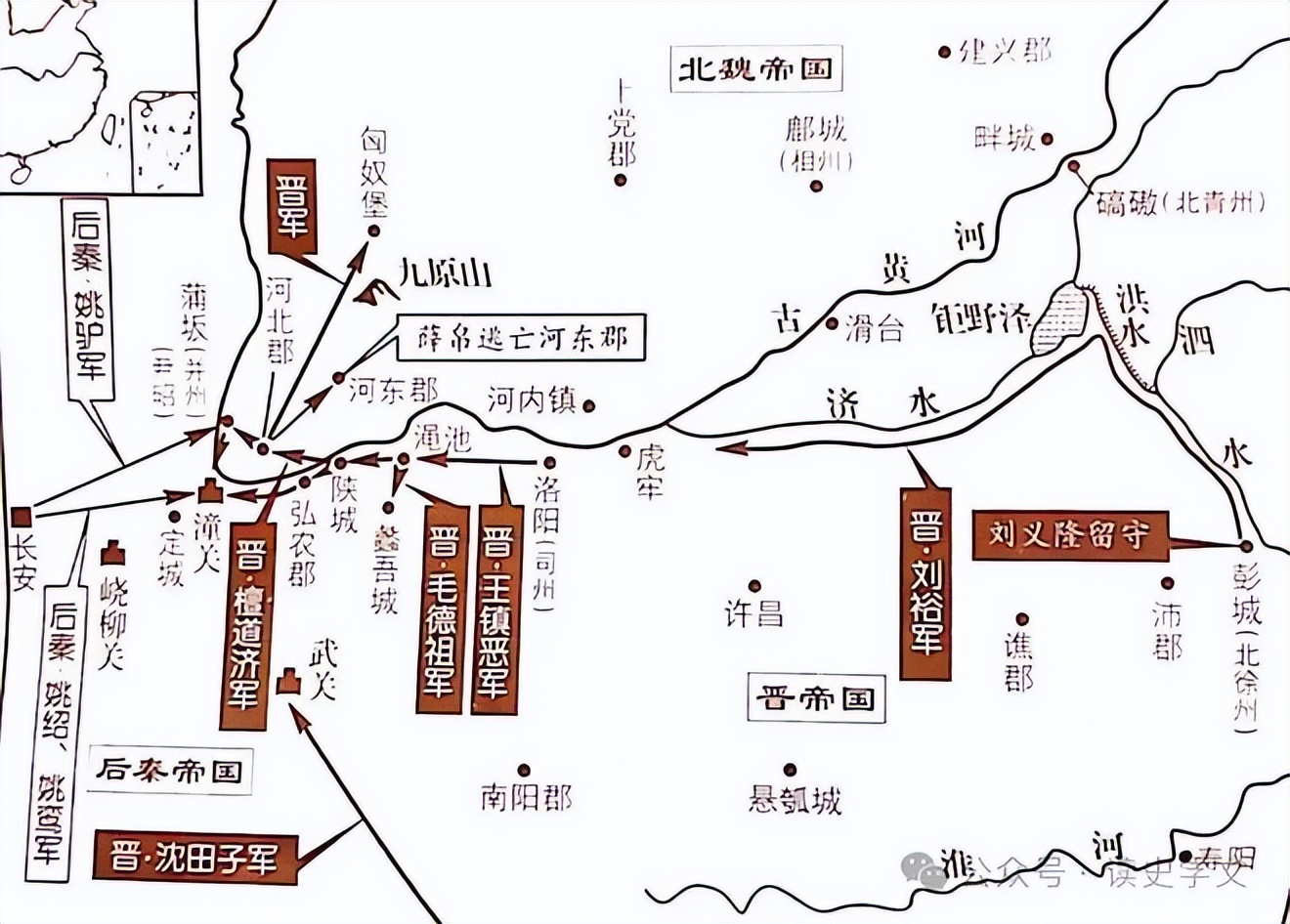 义熙十二年(416年)十二月,就在东晋举国欢庆收复故都的同时,后秦内部却发生了动乱。姚泓之弟、驻防河东的太原公并州刺史姚懿,本来负责与黄河南岸的秦军一起阻挡晋军西进。但他觉得洛阳晋军的实力并不足以攻入关中,反而这是一个让自己取姚泓而代之的大好机会,于是乘乱起兵,在并州治所蒲坂(今山西永济西,乃黄河重要津渡)称帝,并向自己管辖的河东各郡县发布文告,征兵调粮,虽然最终响应的只有临晋(今山西大荔县)的数千镇户,但也让后秦的整个崤函防线七零八落。后秦名将姚绍受命东渡黄河,进剿姚懿叛军,但他前脚刚走,负责防御赫连勃勃的征北将军、齐公姚恢又在安定起兵,率领三万八千镇户杀奔长安,阴密、郿城、扶风等地纷纷投降。后秦朝野大震,姚泓急忙派人召姚绍火速回师保卫长安。