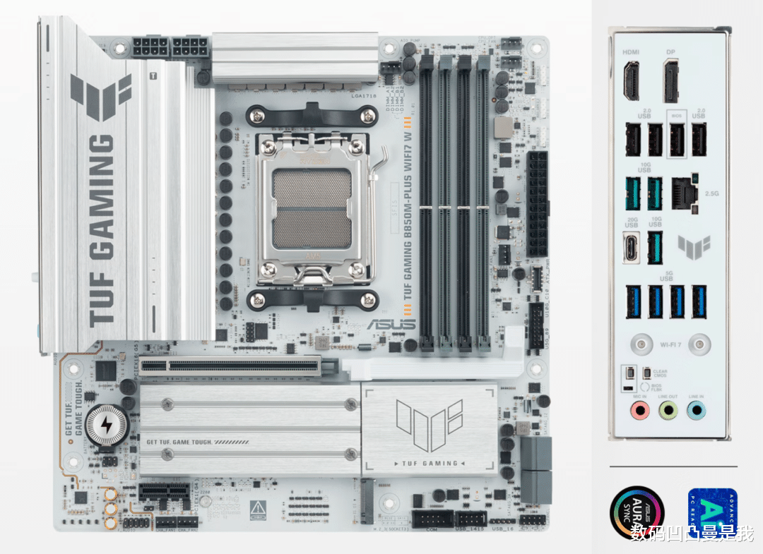 这款主板和前面那款在型号命名上就只有WIFI7和WIFI的区别,可以把TUF GAMING B850M-PLUS WIFI7 重炮手当成二代升级版。这两款主板的整体设计风格都差不多,区别在于TUF GAMING B850M-PLUS WIFI7 重炮手提供黑白双配色,而前面那款只有黑色。