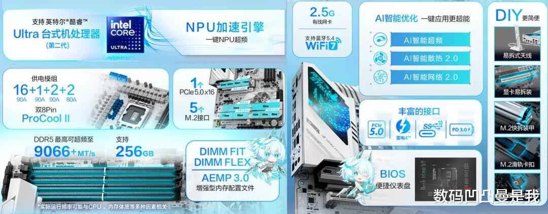 前面几款都是AMD平台,如果考虑Intel平台搭Ultra系列CPU,那这款搭载Z890芯片组的高性能吹雪主板还是很值得考虑的。吹雪系列标志性的纯白PCB和银白色散热装甲搭配点亮后的动态光效,视觉效果超级酷,散热装甲上也有拼合而成的雪武战姬漫画风格图案,非常适合重度二次元美学玩家。