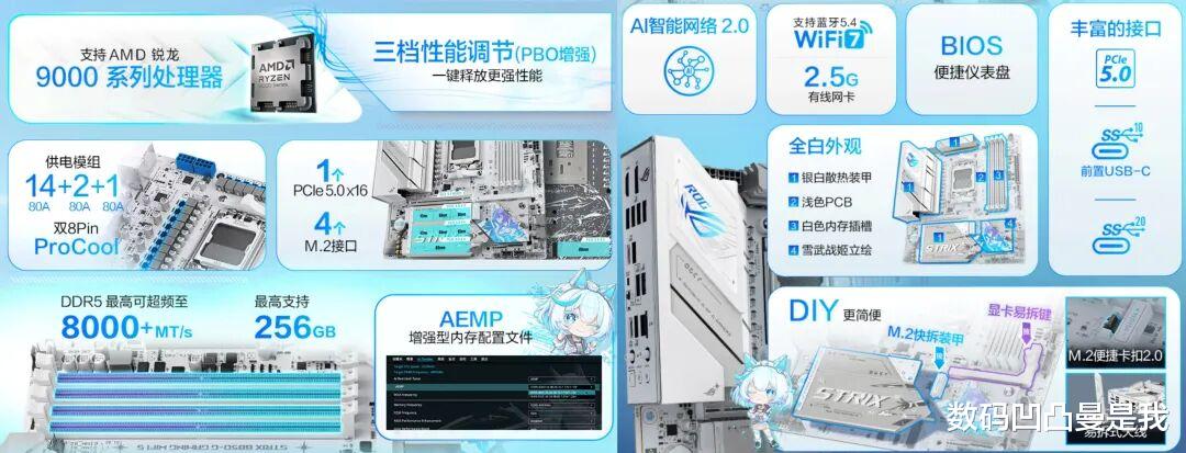 这款主板主打超频。主板采用白色风格,搭配浅色散热装甲和内存插槽,整体风格简洁大方。虽然价格只有千元,但超频性能却是可圈可点,配备12+2+1DrMOS供电模组(80A)、双8-Pin CPU接口,支持锐龙9000系列CPU。提供2个D5内存插槽,支持9600+ MT/s频率(OC),内置AYW OC Profile 一键优化模式,搭配认证内存后,可自动优化内存性能降低延迟。