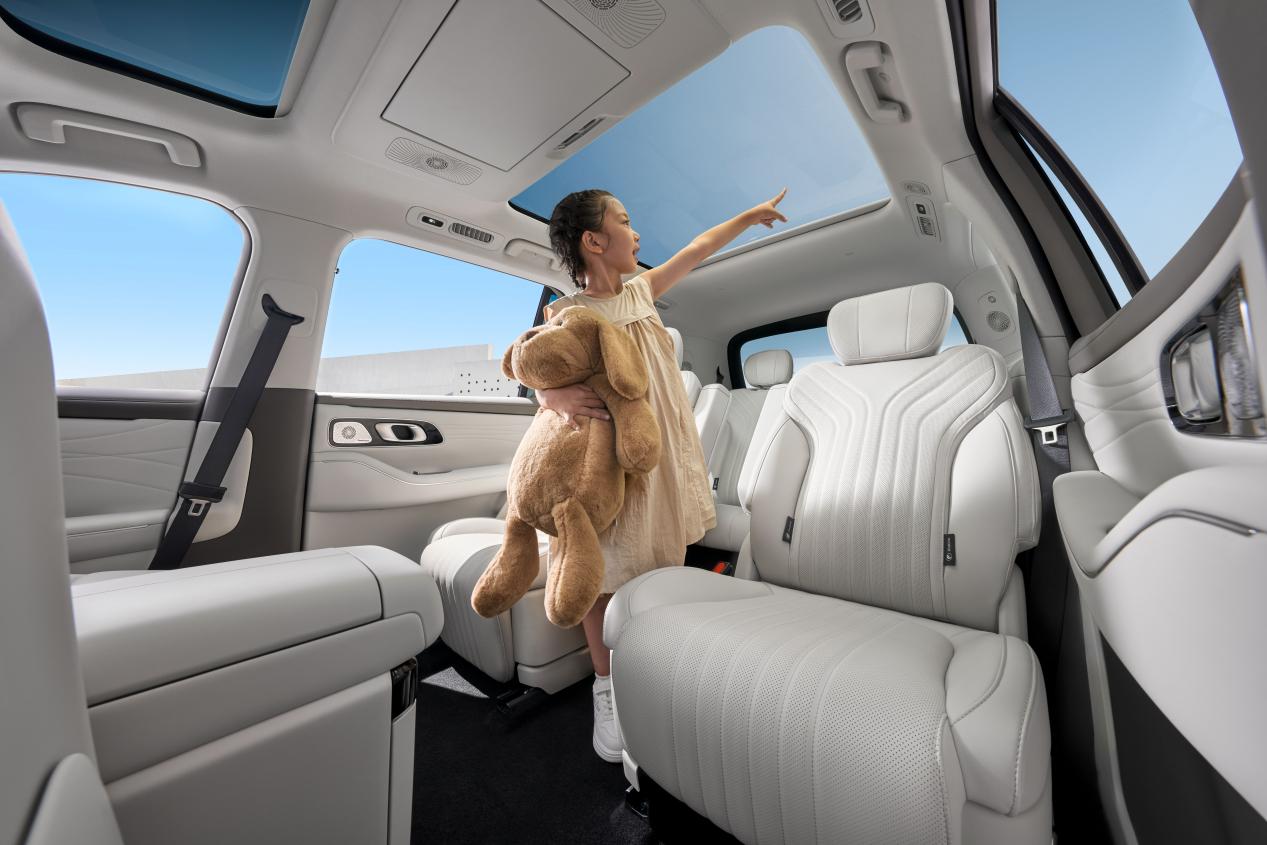 在设计上,吉利银河M9采用星汉涟漪设计语言,由吉利全球设计团队协力打造,外观中正大气,风阻系数低至0.285Cd。车身尺寸为5205mm1999mm1800mm,轴距超3米,车内空间宽敞,得房率达88.3%,实现三排平权乘坐体验。座椅支持8种模式调节,后备箱容积最大可扩展至2171L,满足家庭多元出行需求。