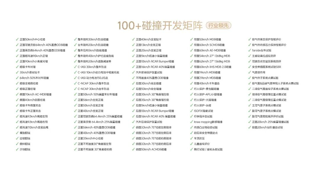 在这点上,理想汽车与中保研的思考不谋而合,坚持以远超常规的严苛测试进行反复验证,主动开展一系列超行业标准的测试验证,目前国内行业公开的开发测试场景总数50余项,理想汽车的企业测试标准超100项,接近行业标准的两倍。