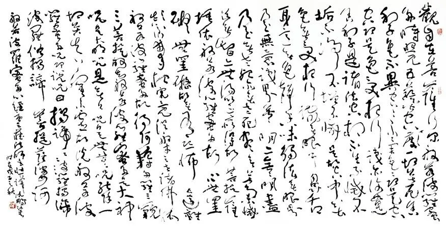沈鹏的《般若波罗蜜多心经》大草横幅是其晚年代表作,融合禅意与艺术,展现了“技道合一”的至高境界‌。作品以篆籀古法入大草,线条圆劲浑厚如“画沙漏壁”,墨色从浓到枯的渐变隐喻“五蕴皆空”的禅理,形成“实中见虚”的辩证关系‌。章法上打破传统佛经书写的工整格局,以动态平衡呼应“无住生心”的禅宗精神,字组聚散如云卷云舒,行气断续似潮起潮落‌。