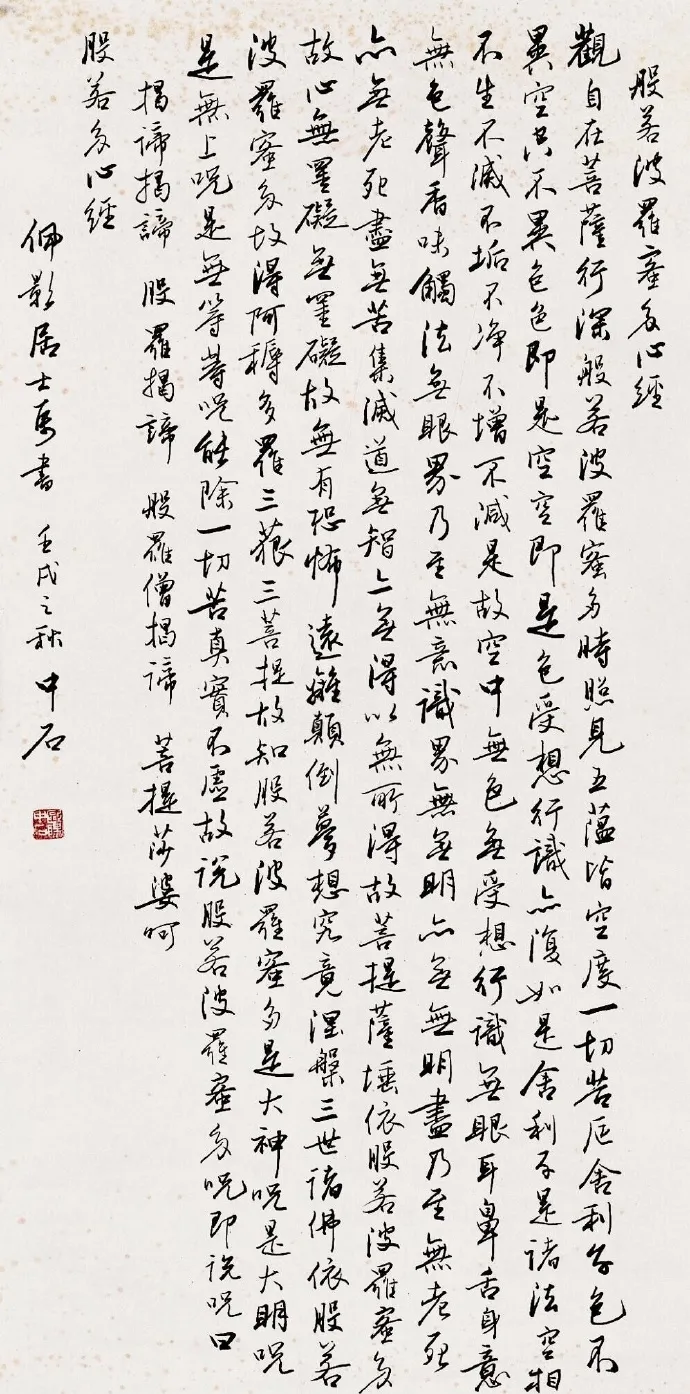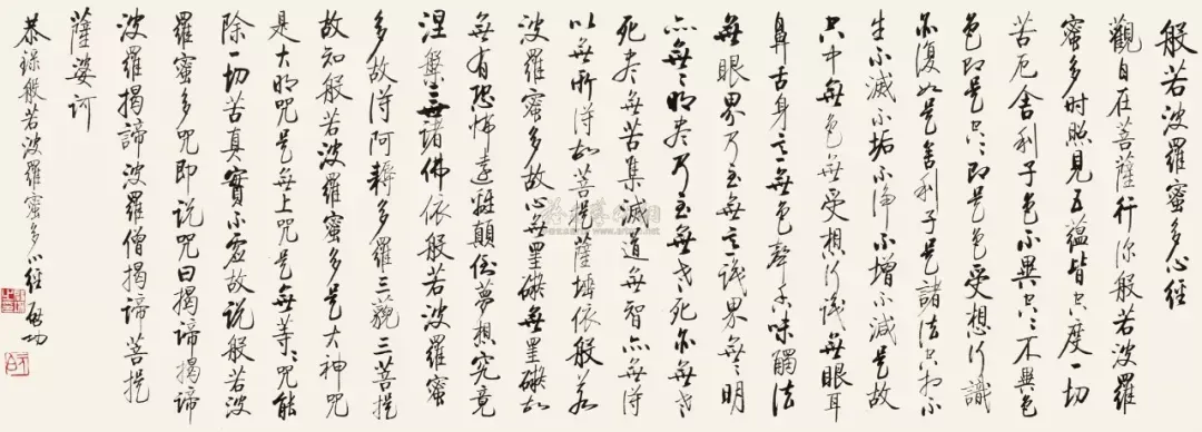 启功的行书《心经》作品,以瘦劲精妙的笔法、挺拔灵动的结构、疏朗雅致的布局,融合传统书卷气与个人禅意哲思,既展现“启功体”的独特美学,又传递《心经》“色空不二”的智慧,成为书法技艺与人文精神完美结合的典范。