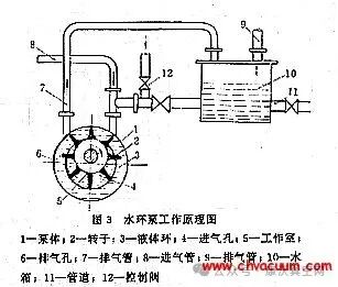 水环泵工作轮2在泵体1中旋转时形成了水环3和工作室5。水环与工作轮构成了月牙形空间。右边半个月牙形的容积由小变大,形成吸气室。左边的半个月牙形的容积由大变小,构成了压缩过程(相当于排气室)。被抽气体由进气管8和进气口4进入吸气室。转子进一步转动,使气体受压缩,经过排气口6和排气管7排出。排出的气体和水滴由排气管道7进入水箱10,此时气体由水中分离出来,气体经管道9排到大气中,水由水箱进入泵中,或经过管道11排到排水设备中。