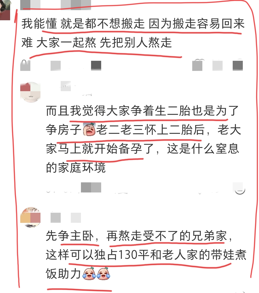 “大家争着生二胎也是为了争房子,老二老三怀上二胎后,老大家马上就开始备孕了,这是什么窒息的家庭环境。”