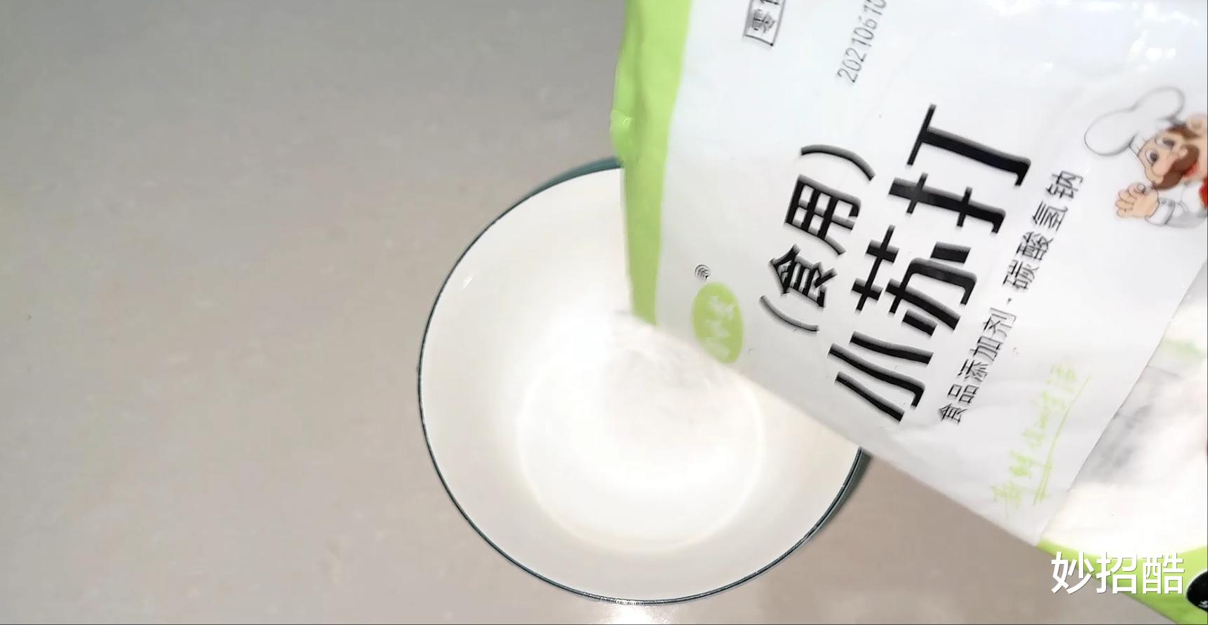 先准备一个容器,在容器里加入一点小苏打。因为小苏打是用来蒸馒头,可以食用的,清洁效果也非常棒。