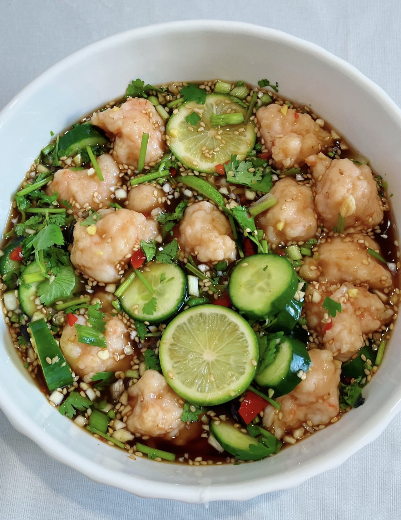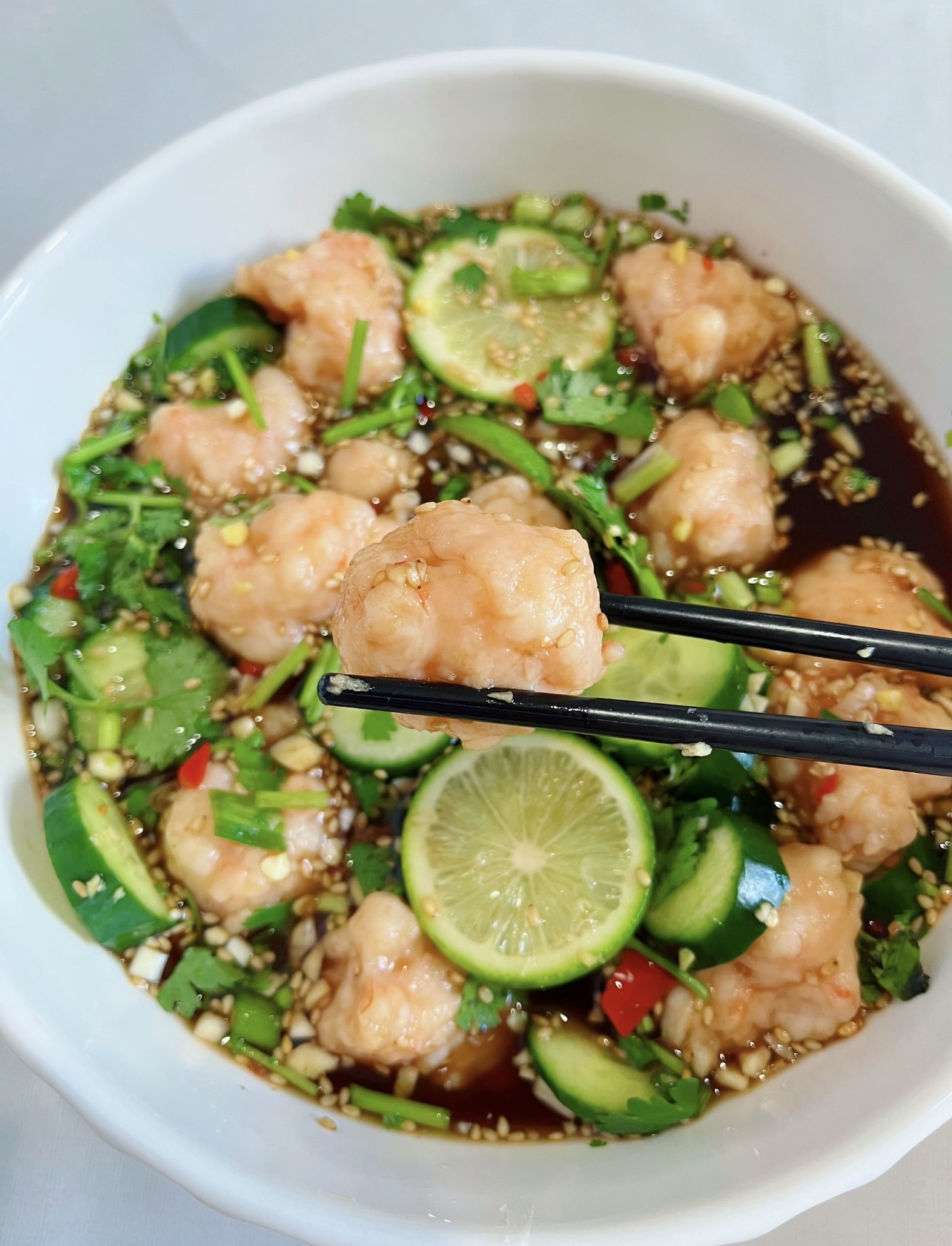用筷子夹起一块虾滑,放入口中,首先感受到的是虾滑的 Q 弹爽滑,接着是柠檬的清新酸味和各种调料的丰富味道。黄瓜的脆爽和香菜的独特香气,为这道菜增添了更多的口感层次。而小米辣和姜蒜末则带来了一丝微微的刺激,让人食欲大增。