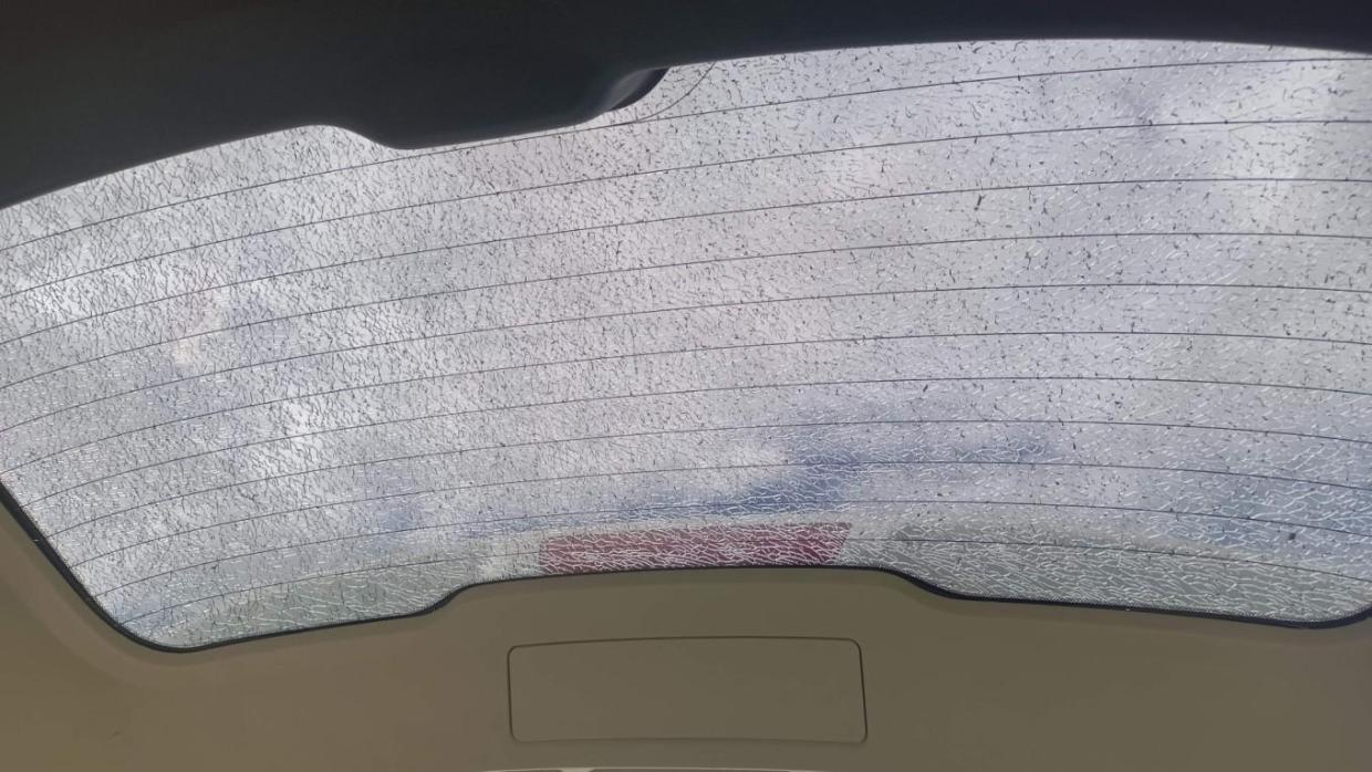 撞击点的玻璃已经脱落,好在其他的玻璃暂时还在一起没有散落