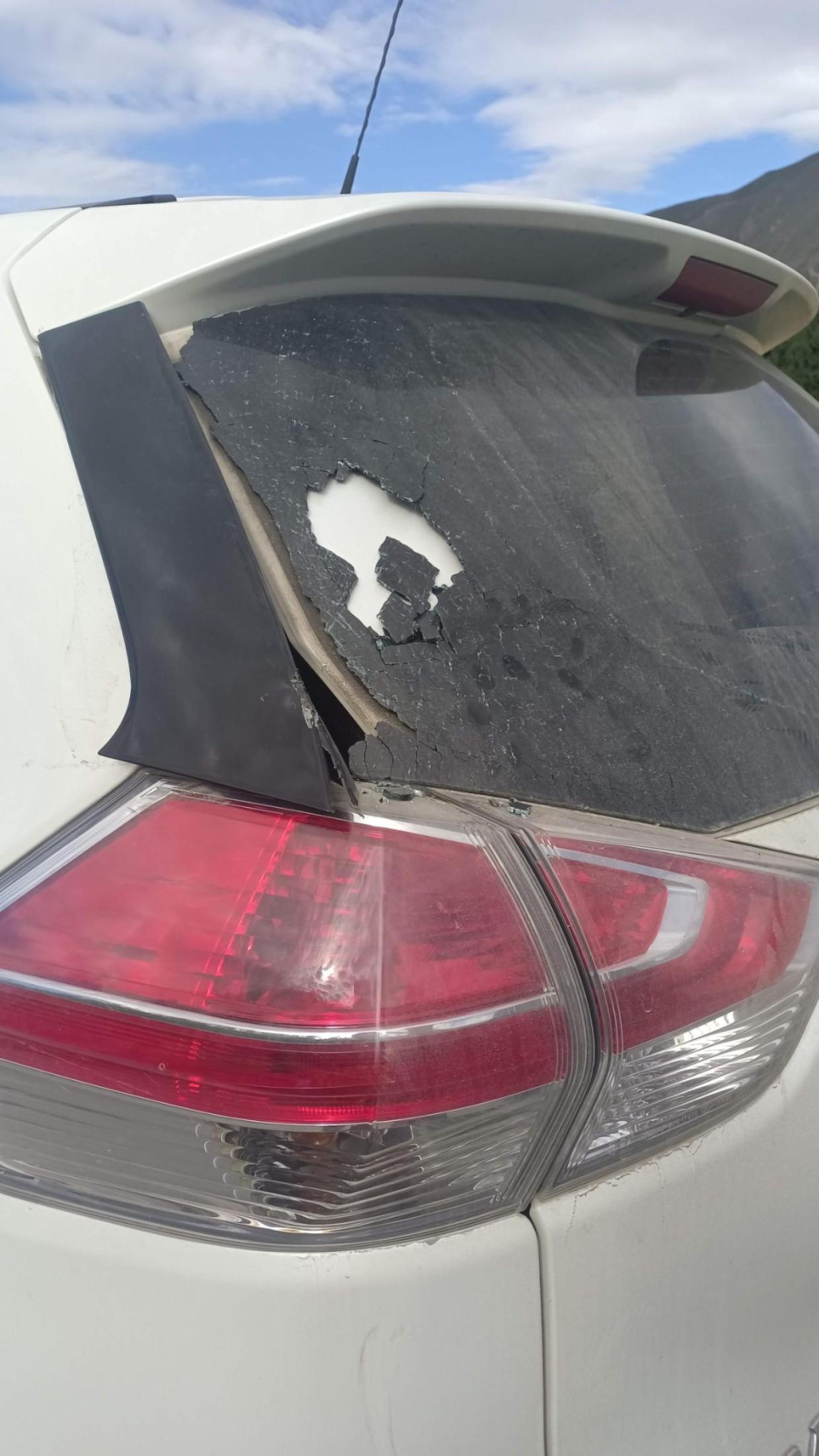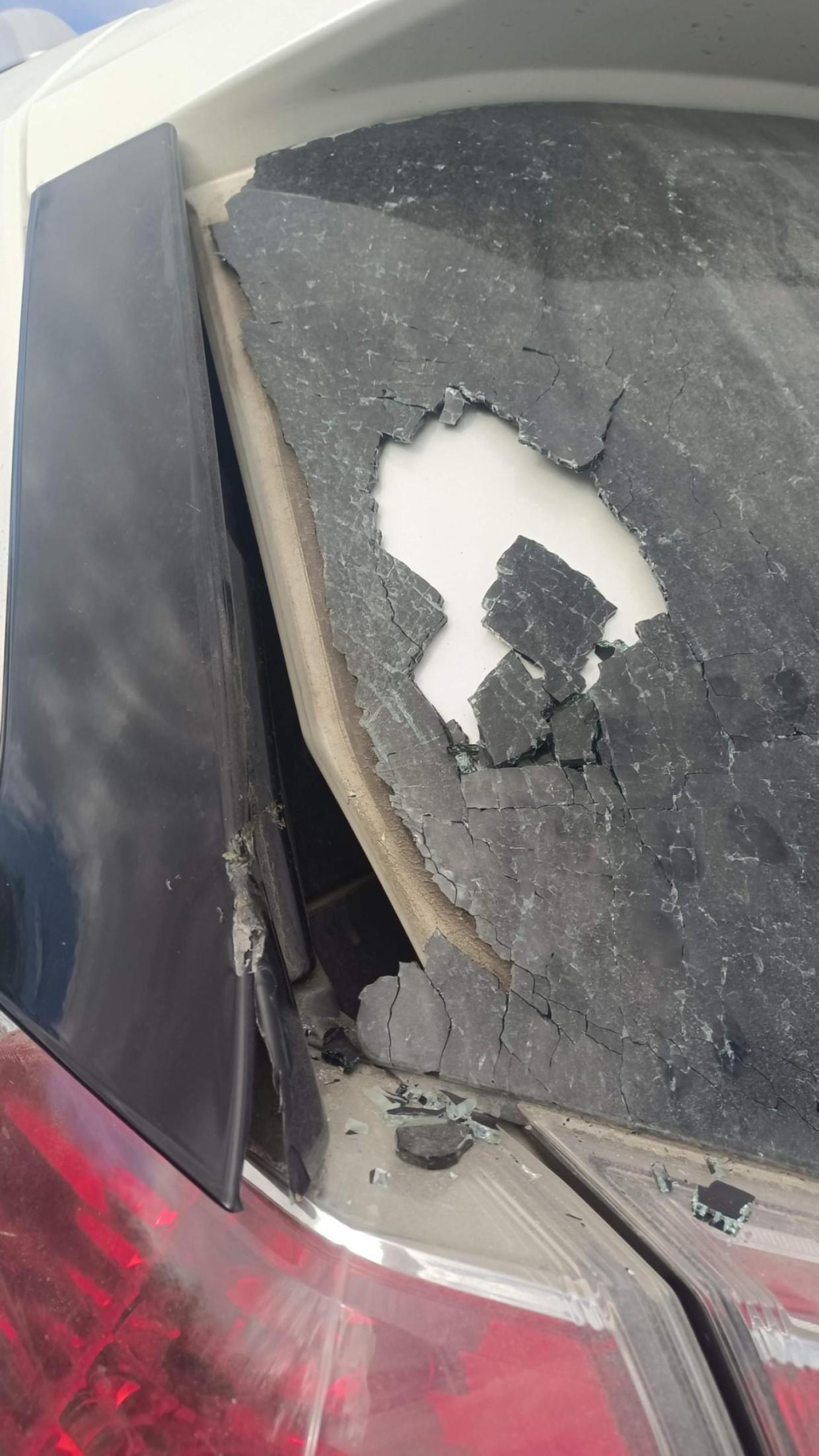 好在我们还有一卷胶带纸,赶紧把后窗玻璃五花大绑起来,希望接下去的行驶过程不会四崩五裂。