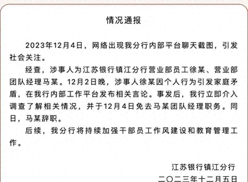 这也正和上述江苏银行官方通报里的“因个人行为引发家庭矛盾”相吻合。
