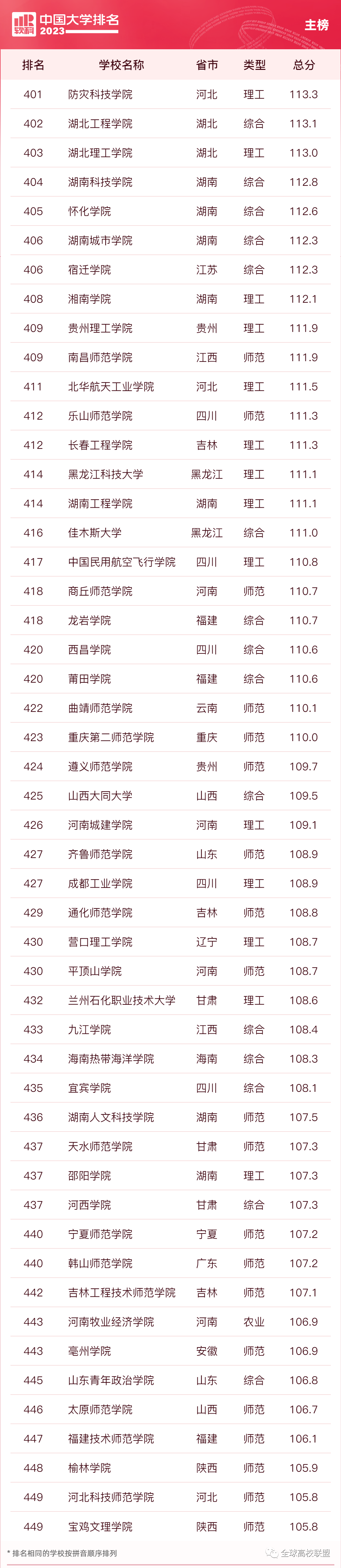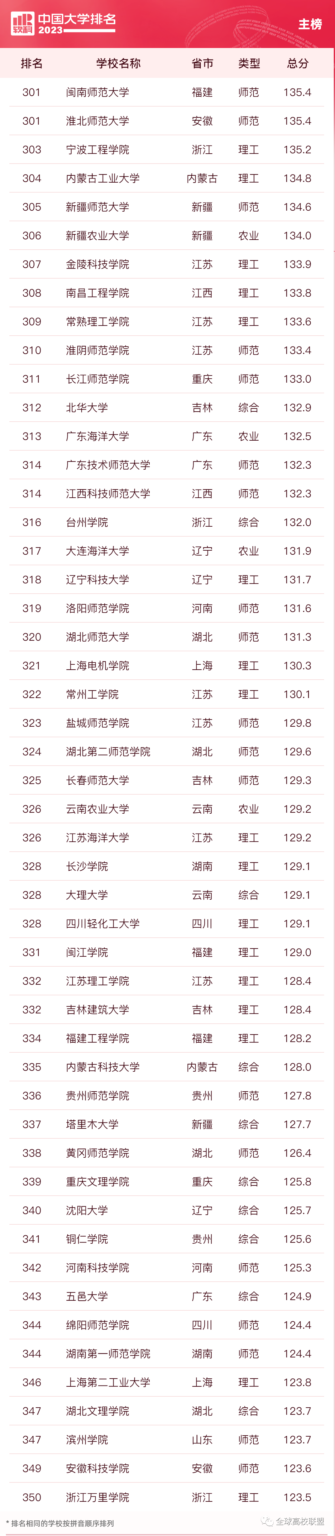 2023软科中国大学排名(主榜)的上榜高校共有590所,清华大学、北京大学、浙江大学连续9年蝉联全国三甲,实力强劲。上海交通大学、复旦大学位列全国前五。其他位列全国前十名的大学依次为南京大学(第六)、中国科学技术大学(第七)、华中科技大学(第八)、武汉大学(第九)、西安交通大学(第十)。