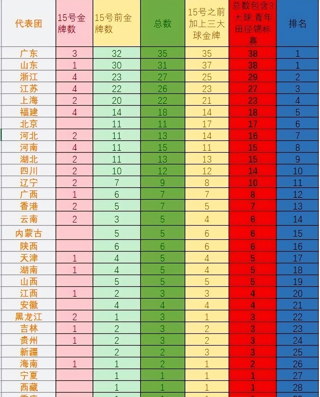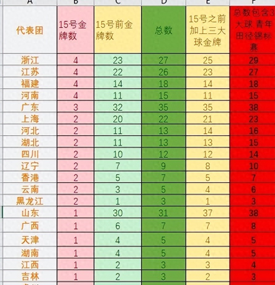 比赛到今天为止,广东和山东各38金,浙江29,江苏27。福建拿到四块之后升到第五,河南排名第八继续往上冲。各个队伍还在比,最后谁能拿第一还不知道,但竞争确实比往年激烈多了。