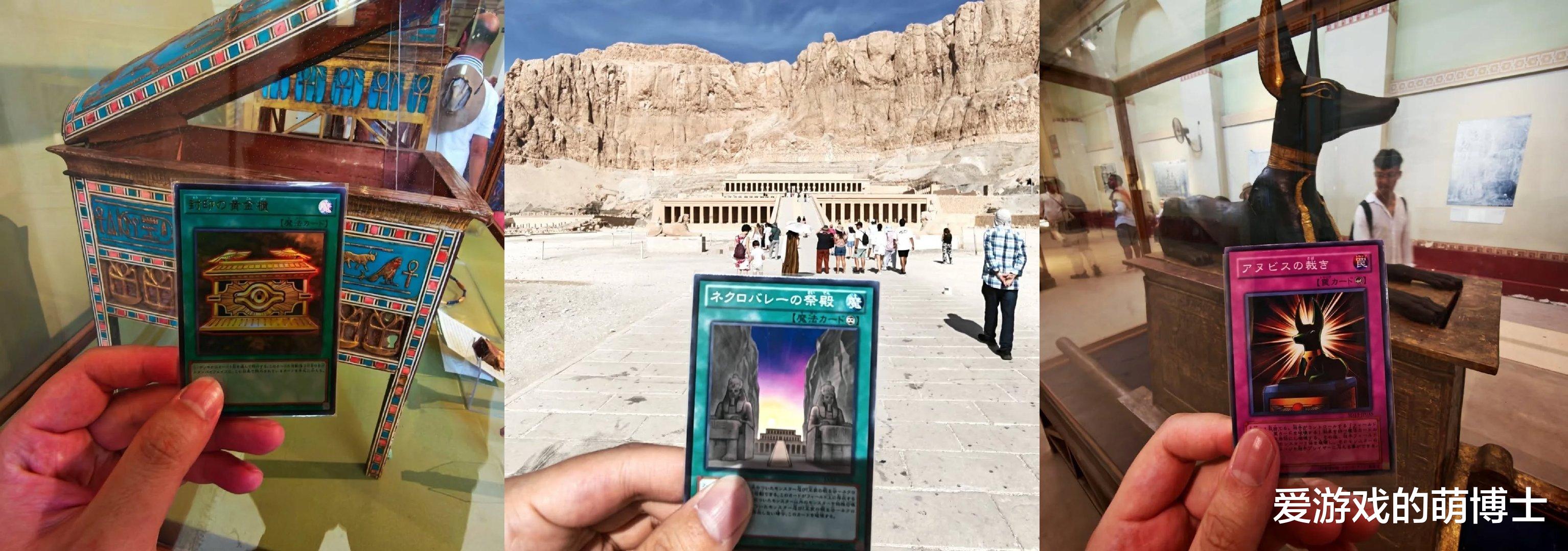 对粉丝来说,埃及不是随便一个旅游目的地,而是动画里那些热血剧情的“现实发源地”。这位粉丝显然把这份情怀刻进了心里,他特意打卡了埃及最具代表性的五个地方:在阿布辛贝神庙前,他掏出 “太阳神的翼神龙”,让卡片上的神之兽与远处的神庙浮雕隔空对话;吉萨金字塔下,“欧贝利斯克的巨神兵”卡片被举起,仿佛下一秒就要有巨石般的力量从卡牌中迸发;哈特谢普苏特神庙、丹德拉神庙,还有摆满古埃及文物的埃及博物馆里,他又依次拿出“黑魔导”、“黑魔导女孩”、“死者苏生”,每一张卡都像一把钥匙,打开了虚拟与现实的次元门。
