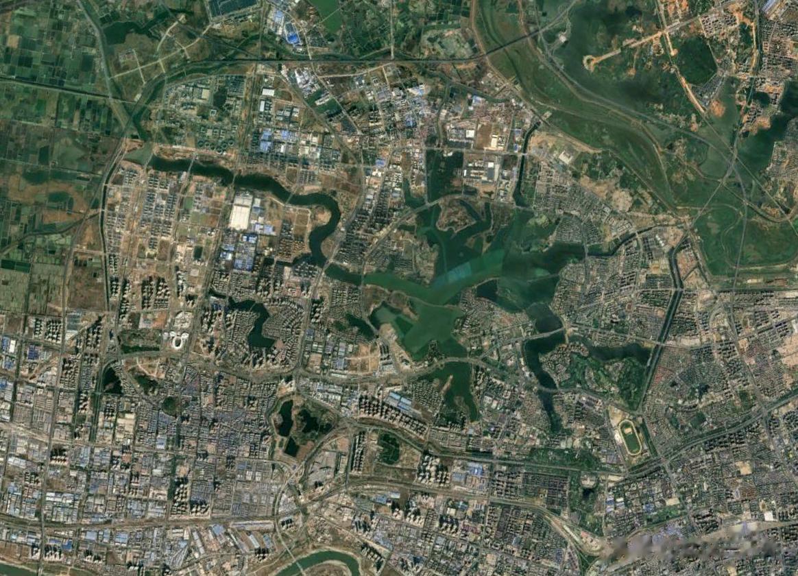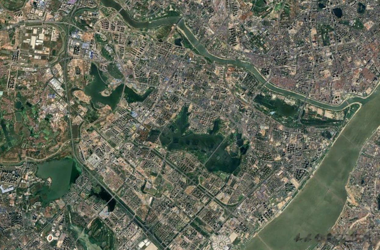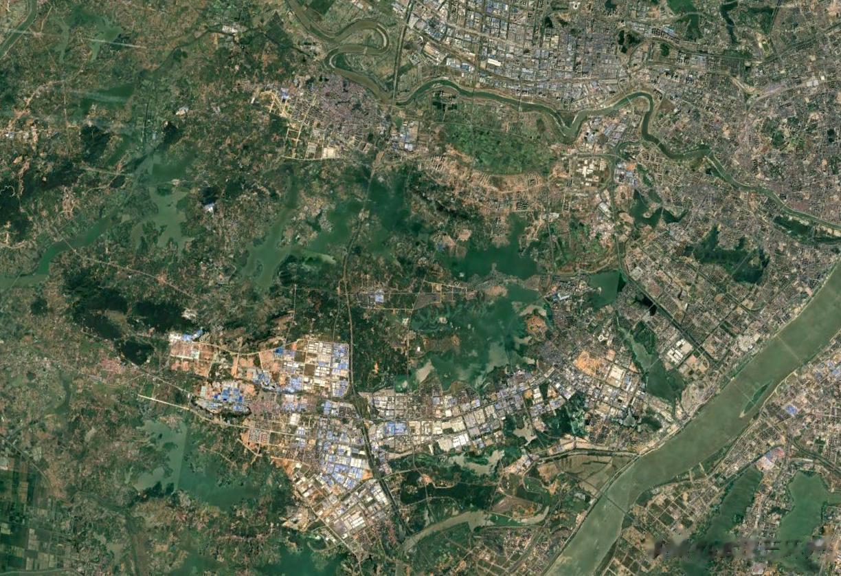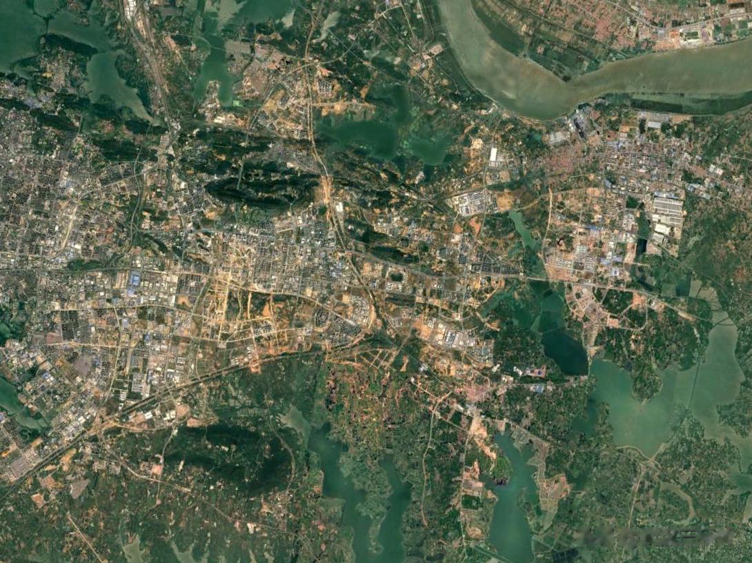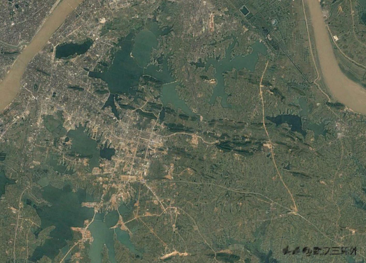 武汉东部,地理方面属于两水夹一条道路,其北面和南面都是大湖,中间则是10来公里左右高度的陆地,下图为2000年左右的武汉东部地区卫星图,大家或许能够对这个地形看得更明白