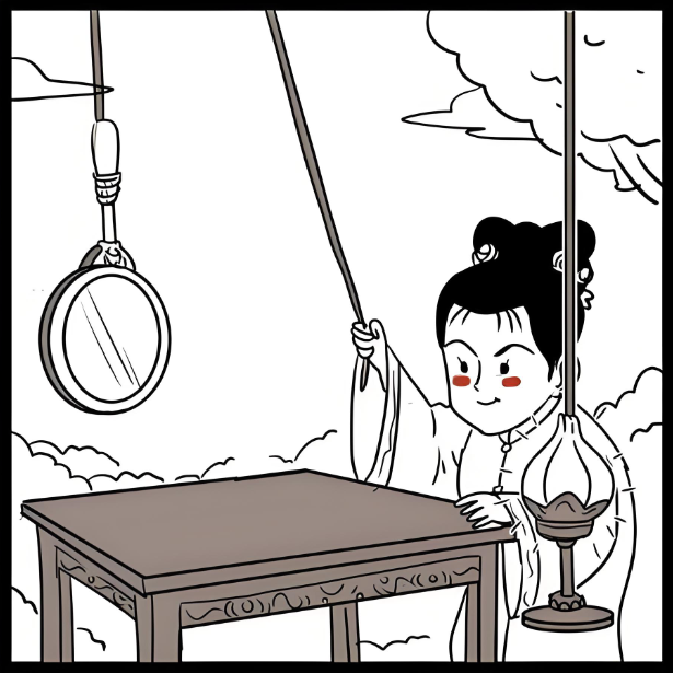 她此时正把自己关在那间昏暗的屋子里,手里没拿针线,也没拿胭脂,而是拿着一面镜子。屋顶的大梁上吊着一盏油灯,正下方的圆桌上放着那个镜子,旁边还摆着一个圆形的物体。