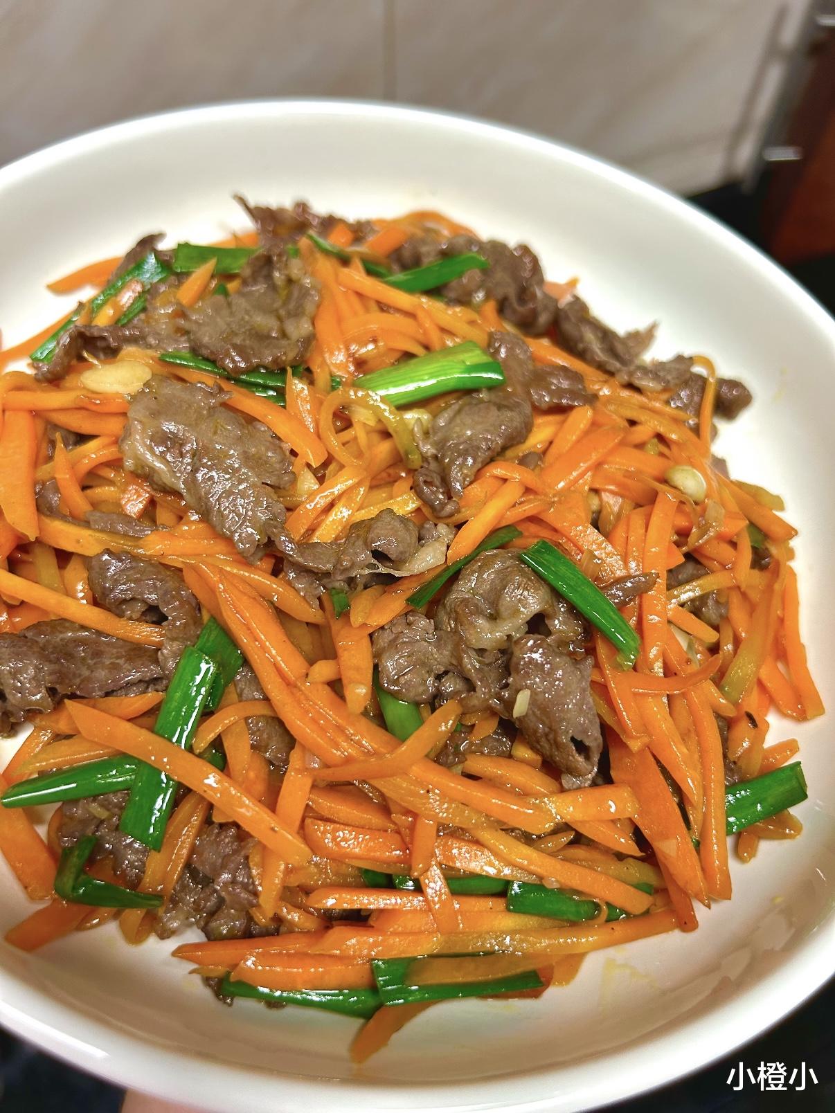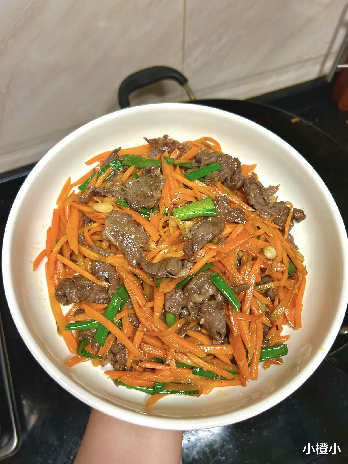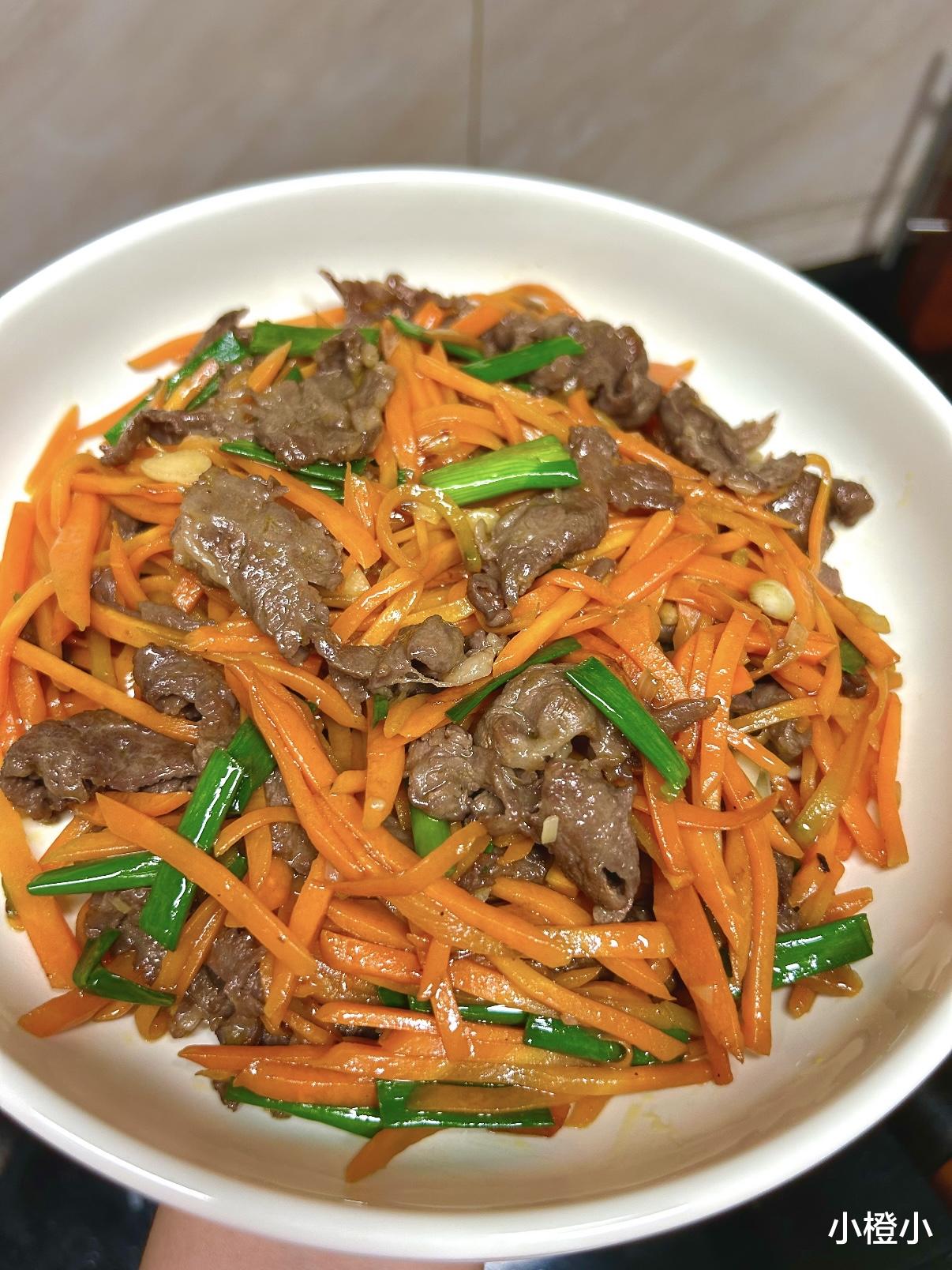 牛肉片+1勺清水+1勺淀粉+半勺油,用手**“按摩”30秒**——淀粉形成“保护膜”,油锁住水分,炒的时候水分“炸”不出来,嫩到像豆腐。最后加1勺生抽+少许糖,腌5分钟(趁腌肉时间切胡萝卜,省时!)。