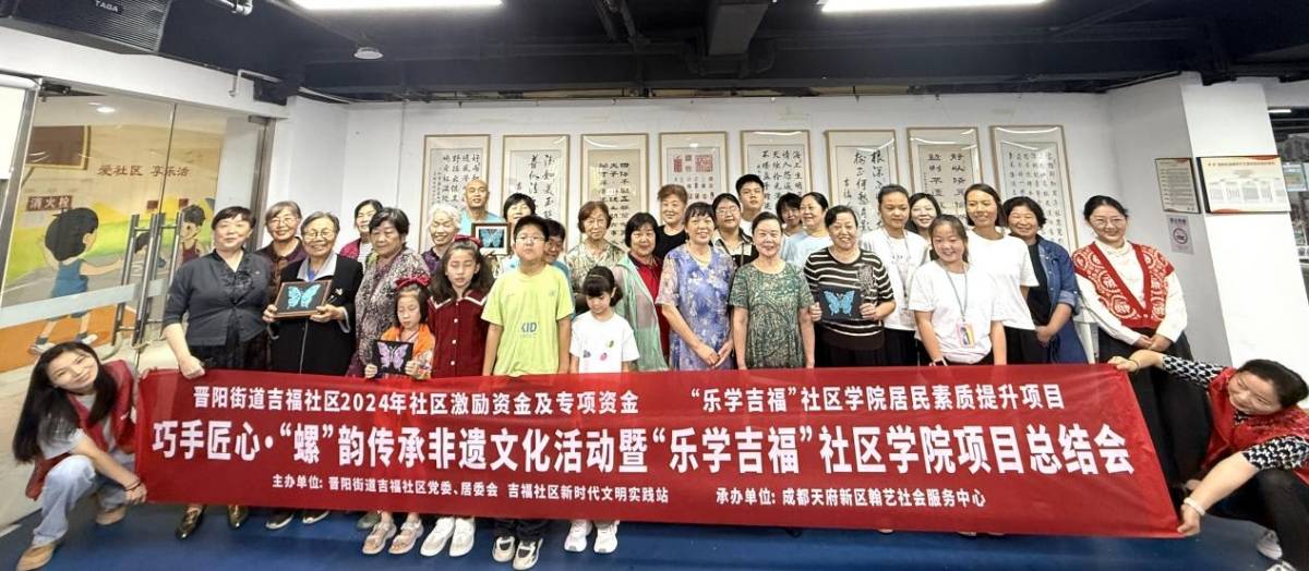 为传承非遗文化、总结社区学院项目成果,吉福社区联合天府新区翰艺社会服务中心开展了巧手匠心•‘螺’韵传承非遗文化活动暨‘乐学吉福’社区学院项目总结会,吸引了30多位居民与青少年儿童参与,旨在响应国家“推动非遗融入现代生活”“加强社区文化建设”的号召,以非遗为纽带,将文化传承与社区治理、居民教育相结合,打造具有“吉福社区”特色的文化品牌,提升社区文化软实力。