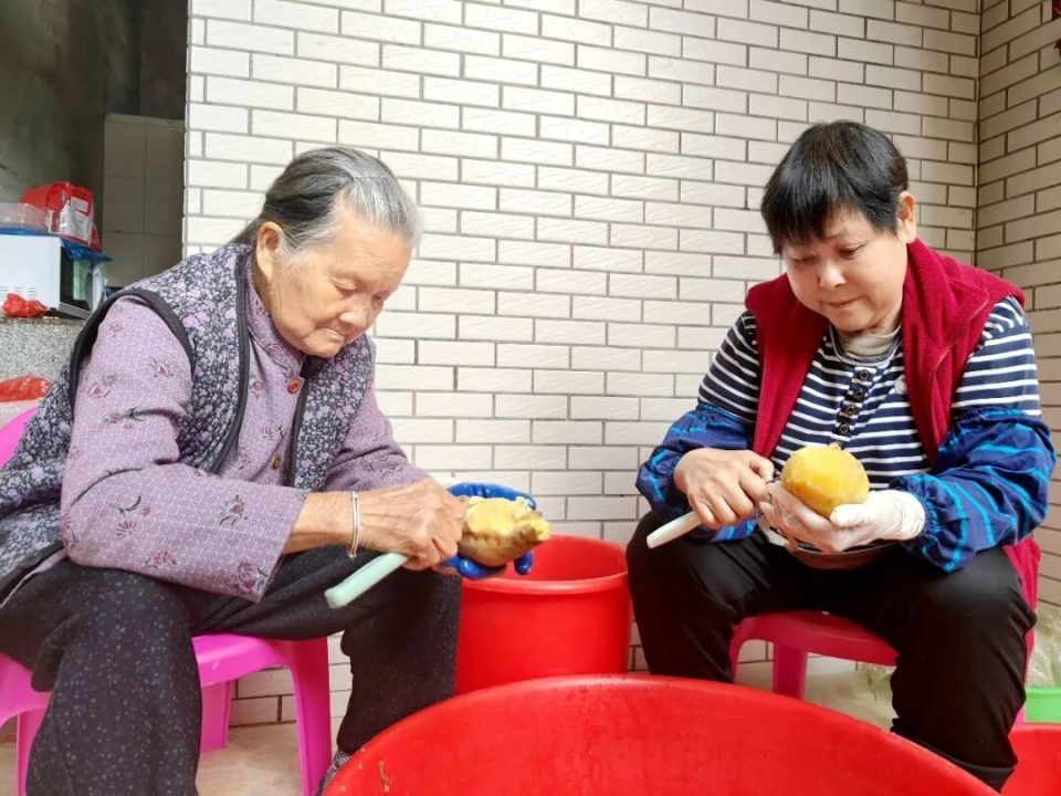 这天上午,村民陈阿姨的家里格外热闹。几位村民分工协作,有的专注地蒸煮番薯,有的细心地剥着薯皮,有的则熟练地将蒸好的番薯切成均匀厚片铺在晒架上,动作娴熟又默契。