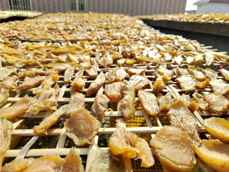 经过阳光的精心“酝酿”,晒好的枫坑番薯干色泽金黄、肉质饱满,咬上一口香甜软糯。陈阿姨表示,“今年我家预计能晒出八九百斤番薯干,售价18元一斤,销路特别好,都是顾客主动上门来买的,在家就能卖完。”