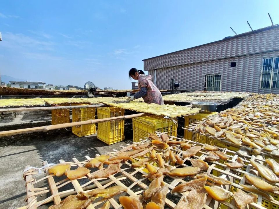 近日天气晴好干燥正是晾晒番薯干的黄金时节三坑镇枫坑村家家户户的庭院里、天台上都铺满了金灿灿的番薯片空气中弥漫着淡淡的薯香