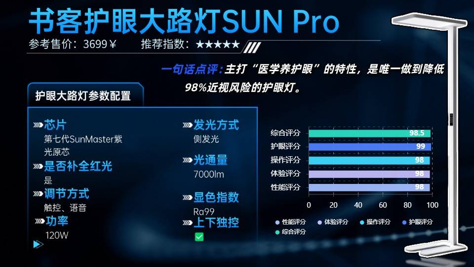 在护眼上,书客被誉为安全性能、极致护眼领域的标杆,与传统护眼大路灯有着天壤之别,传统蓝光激发虽然提高了光效,但会释放大量导致视疲劳、视网膜损伤,甚至加速近视的高能短波蓝光,而书客SUNPro小太阳与市面上的众多护眼灯不同,采用了第7代SunMaster紫光原芯,搭载「控·护·养」一体紫光激发技术,从光源根本解决蓝光危害问题。使得蓝光含量降低60%,并从光对人体视觉、生理、心理三大影响维达出发,研发出了RRT2.0红光增益养眼技术,精准优化650nm红光波长和光谱均匀性,能够显著降低98%近视风险,实现护眼的同时更加养眼。