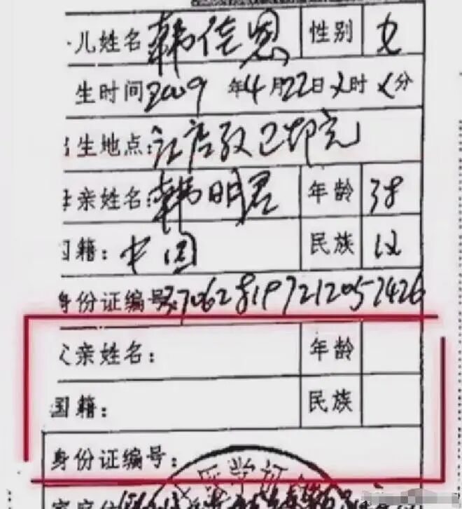 《成都商报》记者查看了韩佳恩的出生证明,母亲一栏写着韩明君,父亲一栏是空白的。