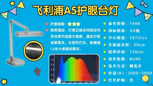 飞利浦A5采用39厘米长条形灯头设计,有效减少书写时的阴影干扰。显色指数达Ra90,满足日常学习和办公需求。外观采用银色金属与ABS材质搭配,灯头背后设有辅助背光,可提供环境光补充。产品照明面积较大,但在色彩还原要求高的场景下可能略显不足。