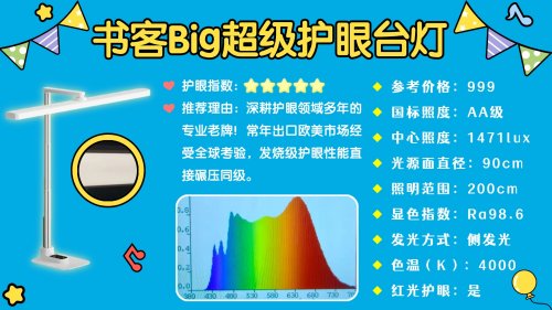 一.前置速选区1.书客Big超级护眼台灯——进阶版护眼天花板,医学级红光养眼技术标杆中心照度:1471lux