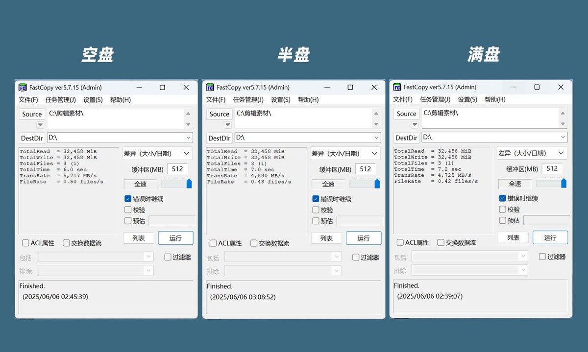 我们再使用Fast copy测试,加一个实际大小32GB的文件在空盘状态下拷入到TP4000 Pro, 用时6秒,速度达到了5717MB/s,再在半盘和满盘状态下进行同样的测试,速率变化也不大,也就是说无论它的数据装载情况如何,依然能够保证更高的传输速度,稳定性表现非常出色。