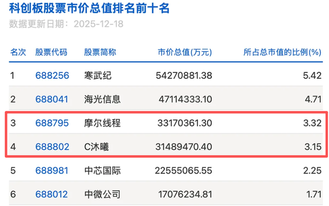 到目前摩尔线程的市值已经达到了3121亿元,在整个科创板,也是排在第三名的,仅次于寒武纪、海光信息。