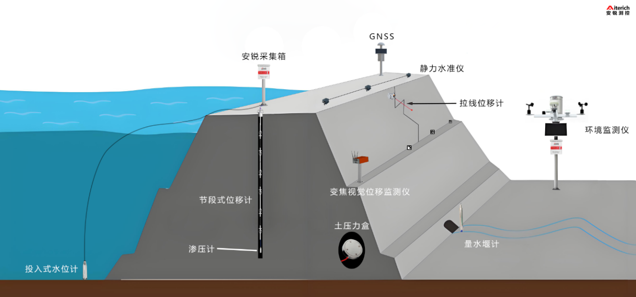 二、大坝监测系统概述智慧水库大坝监测是由前端智能传感器、中端数据采集传输设备与后端安锐测控云平台组成形成三位一体的自动化安全监测体系。系统通过在大坝坝体、坝基、坝肩及库区关键区域布设传感器设备,实时采集坝体表面位移、深部变形、渗流量、扬压力、裂缝、库水位、降雨量及坝体温度等影响大坝安全的关键数据,自动化大坝安全评估,实现对大坝结构稳定性与运行状态的动态感知。