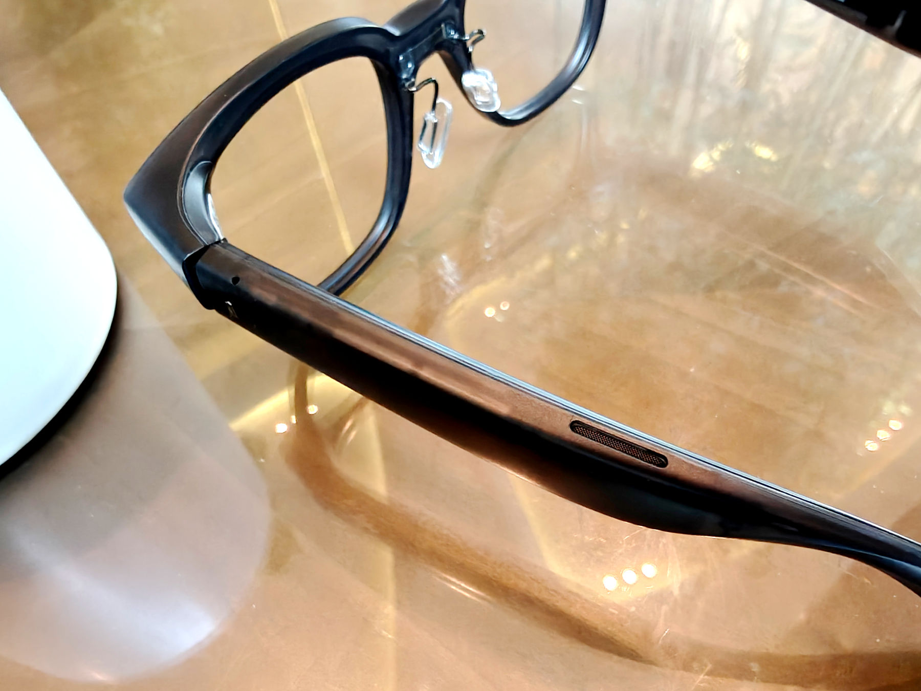在眼镜的左镜腿上有个AI按键,这个按键可以一键唤醒AI,AI功能可以配合眼镜前面的摄像头,和拾音孔,来实现AI识物、翻译、记会议纪这些功能,相当于AI有了眼睛和耳朵,能帮我们去看、去听。因为眼镜上内置了拾音孔,所以我们在合适的场合下,也可以用唤醒词来操控眼镜,说出“小溪小溪”就行。