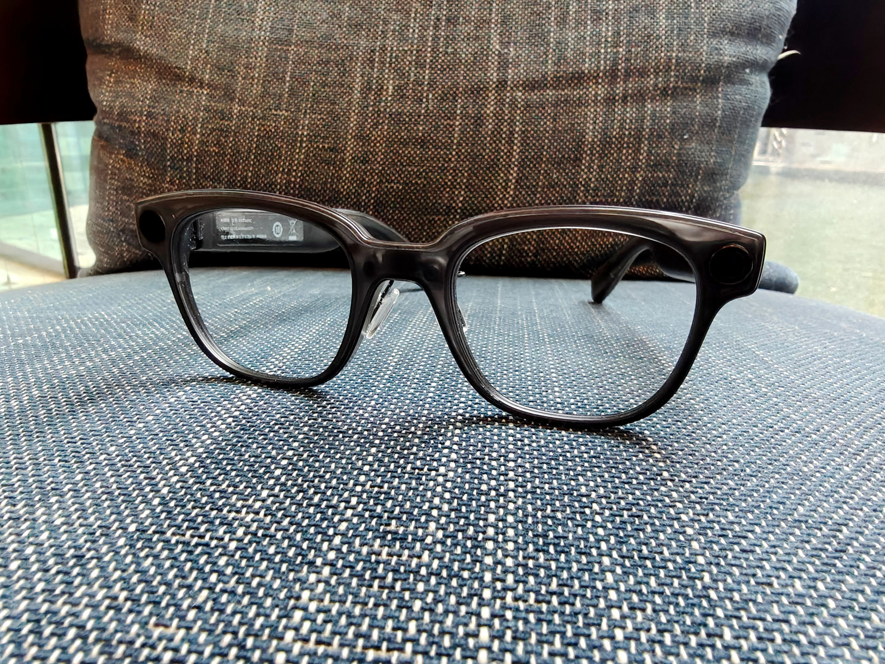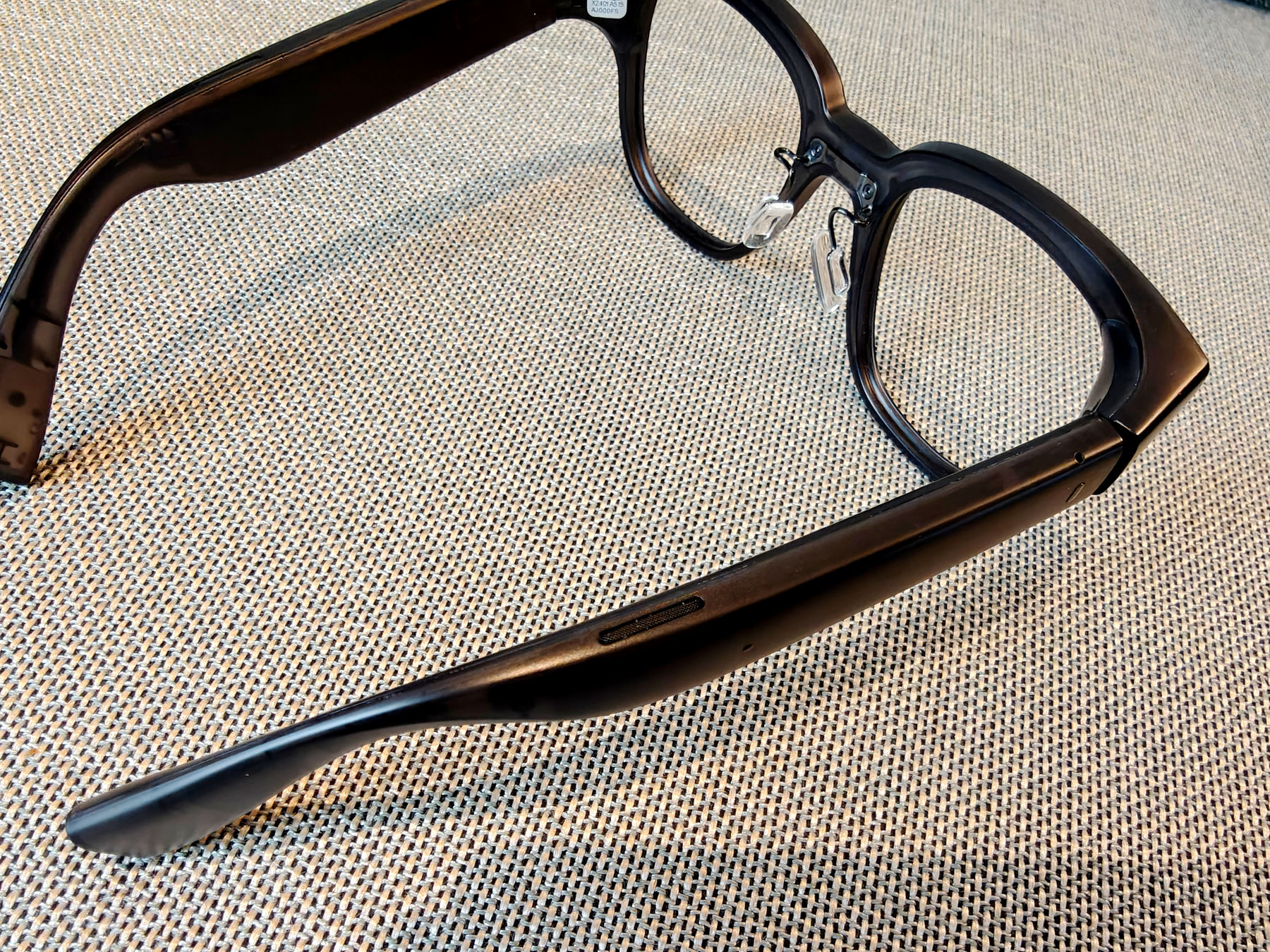先说说外观吧,可能现在很多人一提到智能眼镜,就会自然的联想到以前的AR眼镜,又厚又大,很重,戴着特别闷得慌,又压鼻梁。但我拿到魅族StarV Snap的时候,不细看,我还以为这就是一副普通的近视眼镜,特别轻,39克的重量真不是吹的,细看能看到前面的摄像头和普通眼镜的区别,两个镜腿要稍微宽一些,整体设计是经典的威灵顿框型,镜腿是车规级G3曲面设计,线条做的很流畅,戴上去还挺好看的。