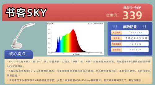 面对主打亮度却表现平平的同价位产品,书客sky选择从技术上的专研到底,打破了“便宜没好货”的刻板理念,通过多道精密光学加工与严苛装配工艺,打造出创新性的5 域环控光学系统。其核心由高密度纳米级导光板与多层次专业扩散膜组合而成,能够在微米级范围内对光线进行均匀折射与扩散,配合上DT多维漫射2.0技术,提升93%光照柔和度的同时,有效消除直射 LED 光源常见的颗粒感与光斑分布不均问题。另外RRT2.0红光养眼技术搭配硬件级低蓝光技术,软硬兼施的相互配合下,凭借精准的拦截400-450nm有害高能蓝光,将红光效果增强至极限,实现每天3分钟“红光”,有效保护视网膜和眼睛其他重要组织,大大减少有害蓝光的影响,将近视风险降低90%。