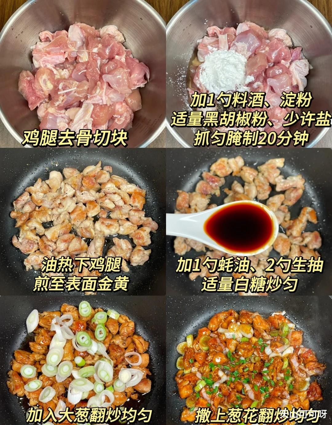 1. 食材准备:三个大鸡腿、一把香葱(葱白部分为主)。2. 处理鸡腿:将鸡腿清洗干净,剔骨切成小块,然后加入料酒、淀粉、黑胡椒和适量盐腌制20分钟。3. 煎制鸡块:锅中倒入少量油,将腌好的鸡块放入锅中煎至表面金黄。4. 调味翻炒:加入生抽、蚝油和一小勺白糖,快速翻炒均匀,让鸡肉充分吸收酱汁。5. 加入大葱:放入切好的葱段,翻炒几下后盖上锅盖焖煮1分钟,最后撒上葱花点缀即可。