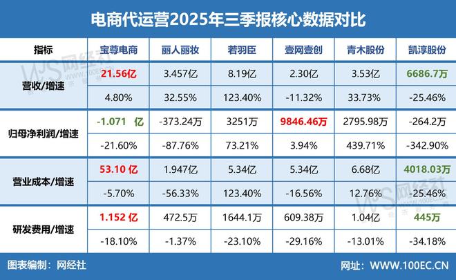 此前,宝尊电商、丽人丽妆、若羽臣、壹网壹创和青木股份、凯淳股份这六家电商代运营商上市公司相继发布2025年第三季度业绩报告。