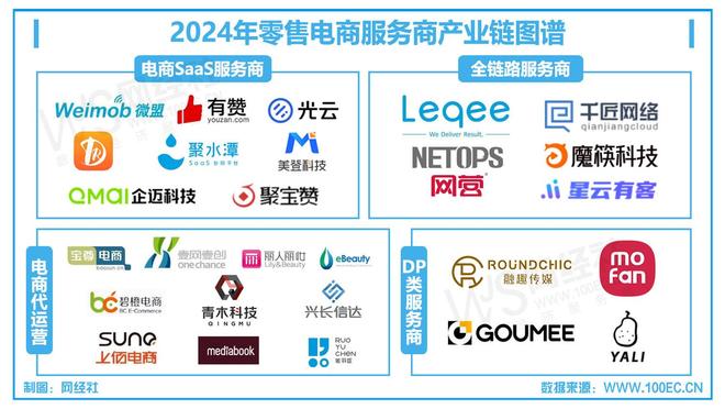 网经社企业库显示,除极易科技外,电商服务商公司还包括电商代运营:悠可、碧橙电商、上佰电商、火蝠电商、索象电商等;电商SaaS服务商类:微盟、有赞、光云科技、聚水潭、企迈科技;全链路服务商:乐其电商、千匠网络、网营科技、魔筷科技;DP类服务商:融趣传媒、构美等。