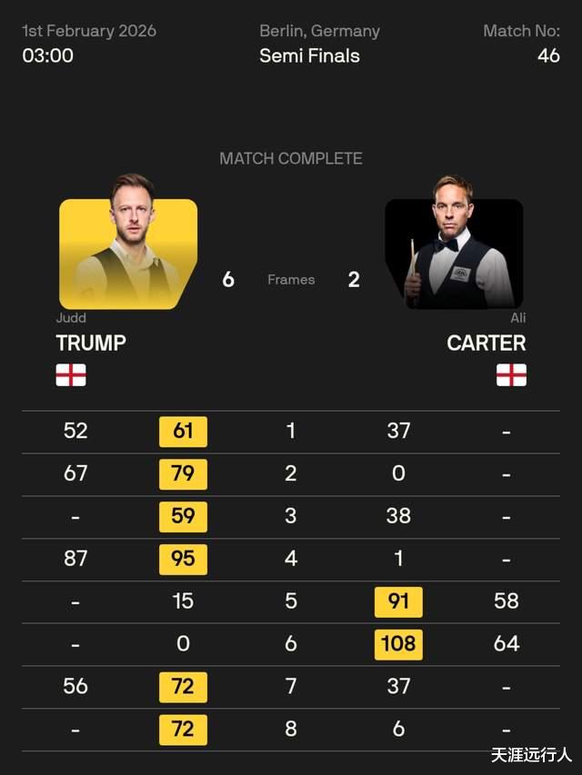 接下来特鲁姆普,连胜两局拿下比赛,以6-2战胜阿里·卡特,本赛季第四次跻身决赛,将和肖恩·墨菲争夺冠军。